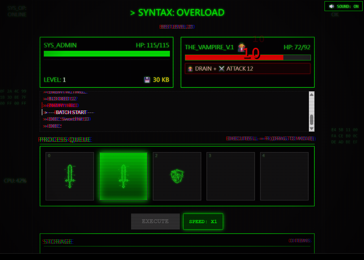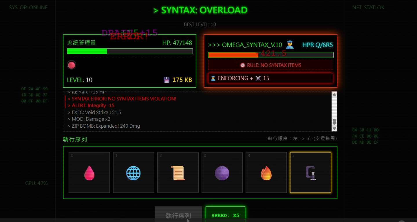 Syntax: OVERLOAD is a strategic roguelite where you don't just play cards—you write the code. Drag and drop modules into your Process Queue, but remember: Syntax is everything.